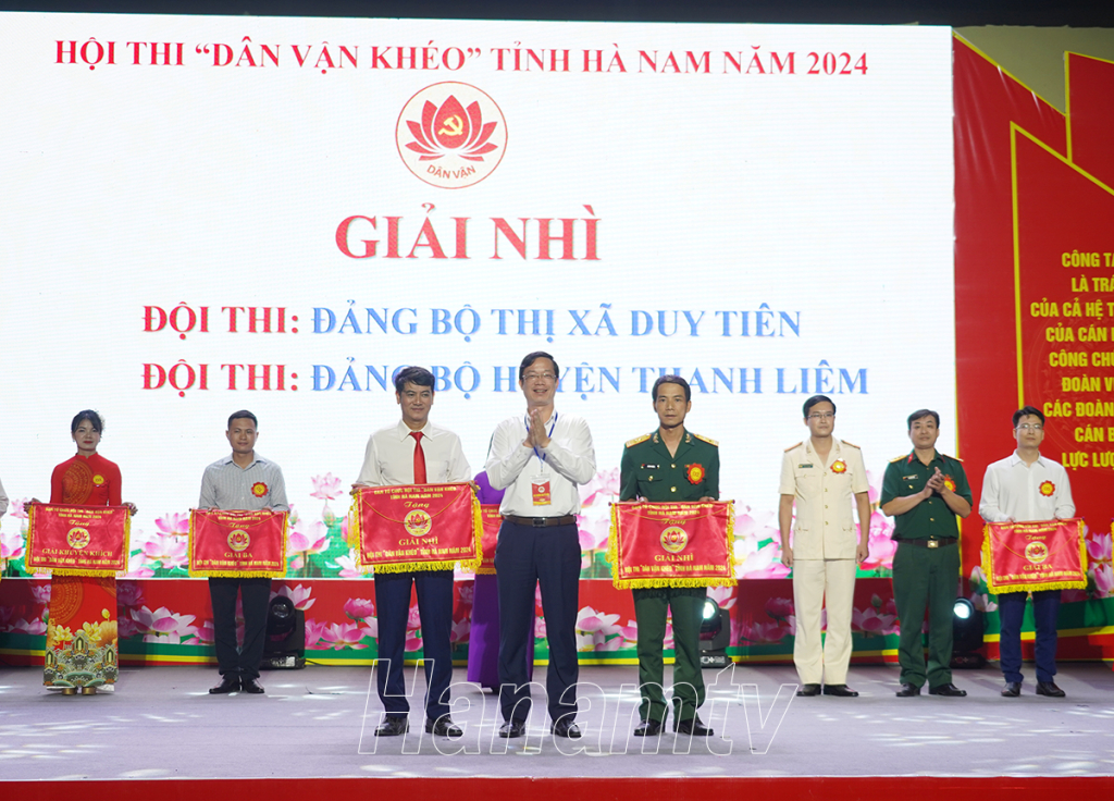Đồng chí Nguyễn Minh Tiến, Ủy viên BTV Tỉnh ủy, Trưởng Ban Dân vận Tỉnh ủy trao giải Nhì cho 2 Đội thi của Đảng bộ Thị xã Duy Tiên và Đảng bộ huyện Thanh Liêm.