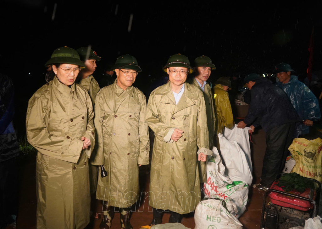 Kiểm tra công tác khắc phục sự cố sạt trượt mái đê hữu sông Hồng (còn gọi là đê Đại Hà), đoạn qua xã Tiến Thắng, huyện Lý Nhân, đồng chí Bí thư Tỉnh ủy đánh giá cao sự chủ động của huyện Lý Nhân trong việc khắc phục giờ đầu sự cố. Đồng chí yêu cầu huyện Lý Nhân khẩn trương xử lý sự cố ngay trong đêm nay với phương châm “4 tại chỗ”; tiếp tục theo dõi diễn biến sự cố để chủ động ứng phó. Đồng thời, phải bố trí lực lượng ứng trực 24/24 tại toàn tuyến đê, kịp thời phát hiện sự cố và xử lý ngay giờ đầu, không để xảy ra thiệt hại về người và tài sản của nhân dân.