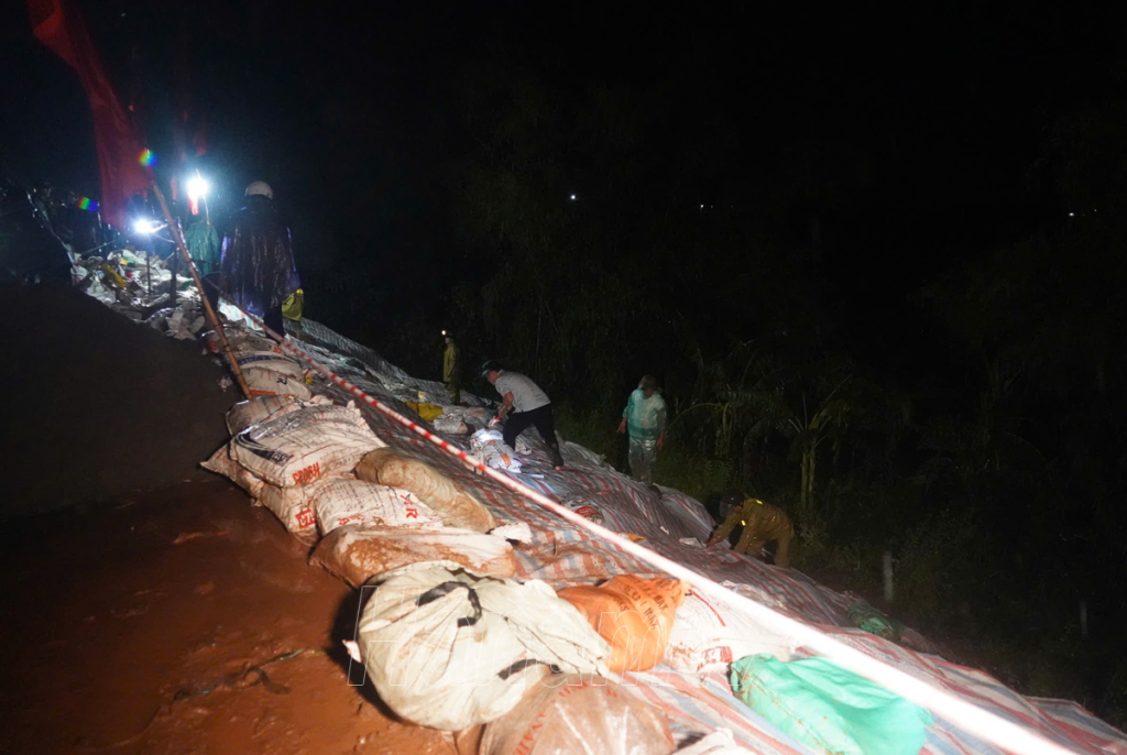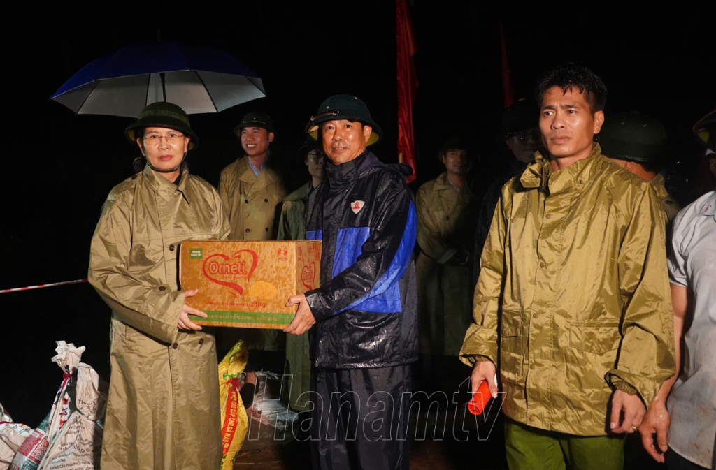 Hiện các lực lượng vẫn đang tập trung xử lý sự cốĐồng chí Bí thư Tỉnh ủy tặng quà, động viên lực lượng làm nhiệm vụ khắc phục sự cố sạt trượt mái đê Đại Hà, đoạn qua xã Tiến Thắng, Lý Nhân.