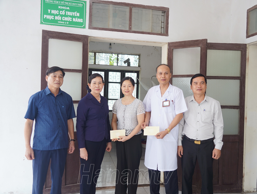 Nhân dịp này, đồng chí Bí thư Tỉnh ủy đã tặng quà động viên lãnh đạo Trung tâm Y tế thị xã Duy Tiên và Trung tâm điều dưỡng thương binh Duy Tiên, đồng thời căn dặn các lãnh đạo, cán bộ, nhân viên các Trung tâm cần tiếp tục cố gắng làm tốt hơn nữa công tác chăm sóc cho các bác thương bệnh binh, các bệnh nhân trong điều kiện nhiều hoạt động bị ảnh hưởng bởi mưa lũ, ngập lụt sau bão số 3.
