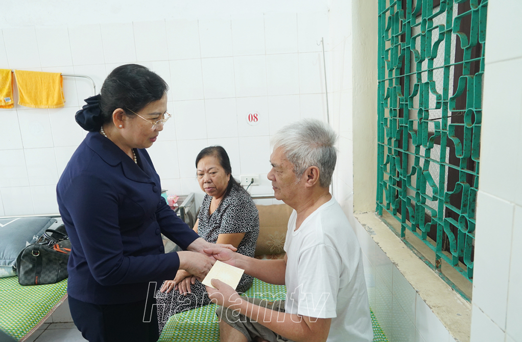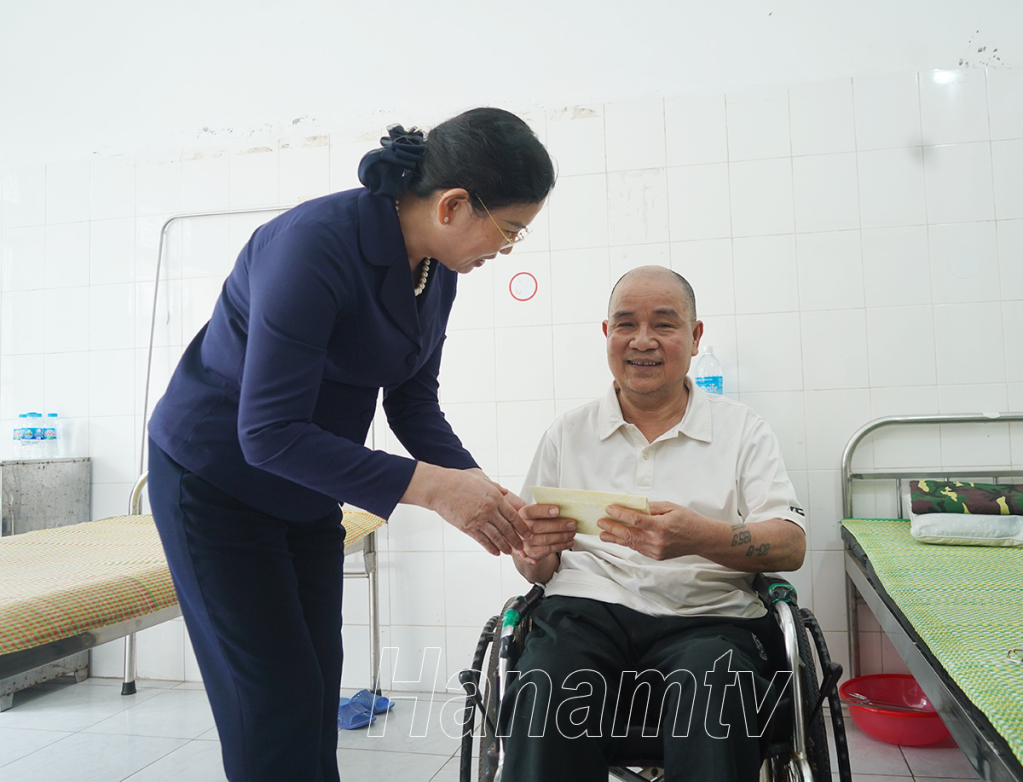 Đồng chí Bí thư Tỉnh ủy Lê Thị Thủy tặng quà các thương binh nặng của Trung tâm điều dưỡng thương binh Duy Tiên hiện đang được chăm sóc, điều dưỡng tại Trung tâm y tế Thị xã.