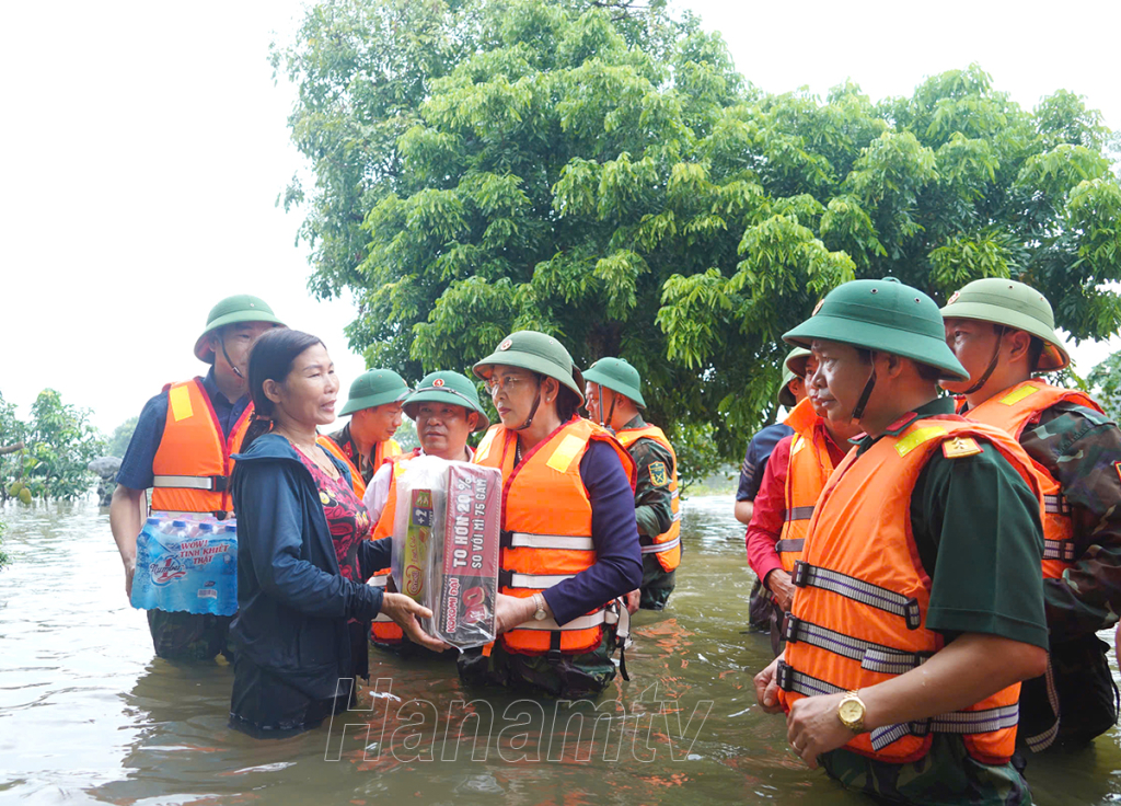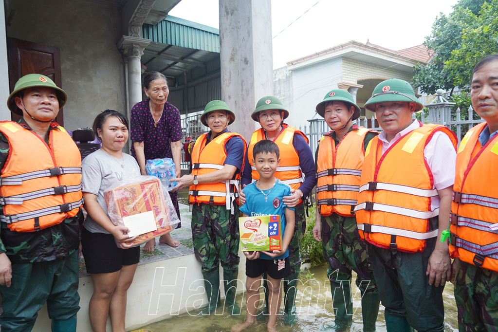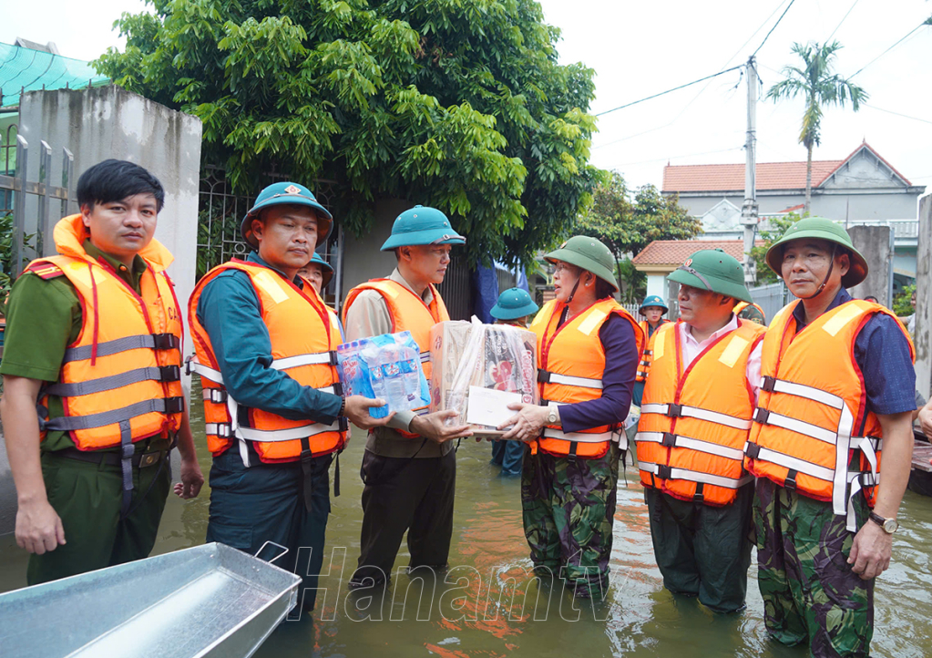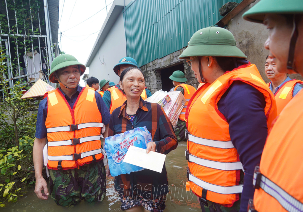 Đồng chí Lê Thị Thủy, Ủy viên Trung ương Đảng, Bí thư Tỉnh ủy, Chủ tịch HĐND tỉnh cùng các đồng chí lãnh đạo tỉnh, huyện và các ngành trực tiếp xuống thăm, tặng nhu yếu phẩm cho nhiều hộ dân bị ngập sâu tại thôn Trung Hiếu Hạ, xã Thanh Hải, huyện Thanh Liêm.