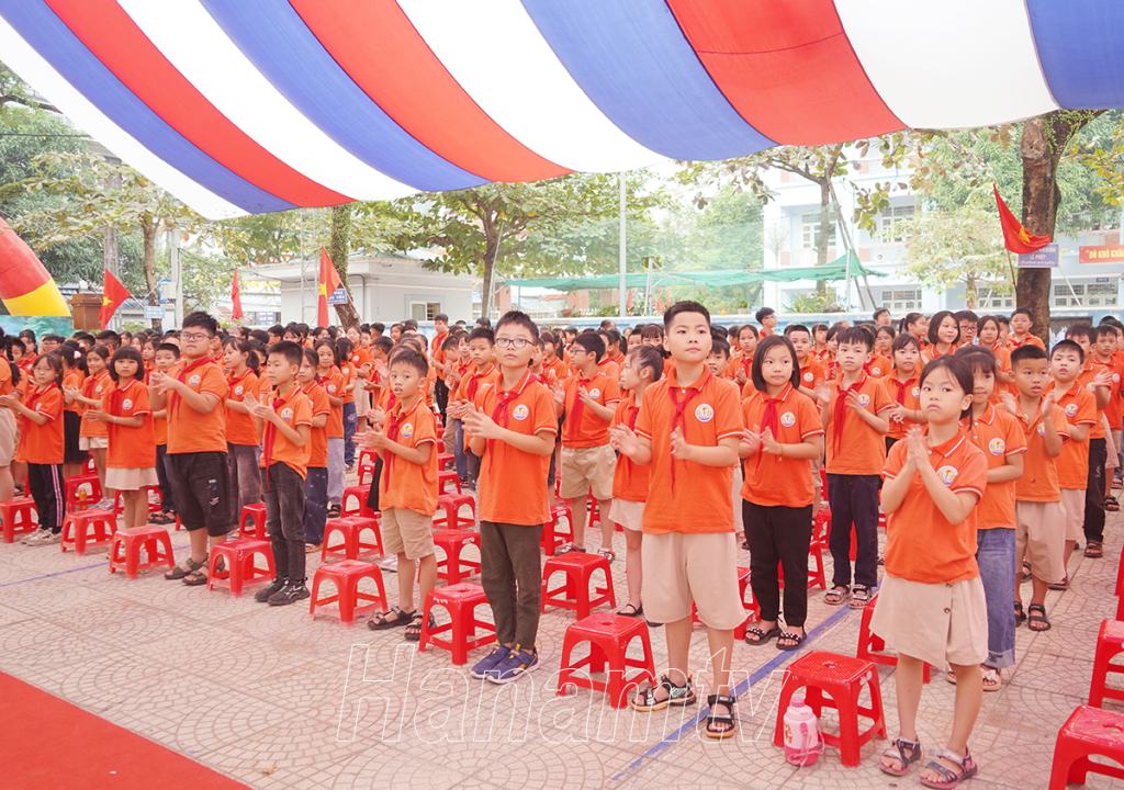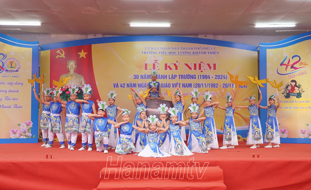 Tiết mục văn nghệ chào mừng tại lễ kỷ niệm của các học sinh Trường Tiểu học Lương Khánh Thiện.Học sinh nhà trường dự buổi lễ.