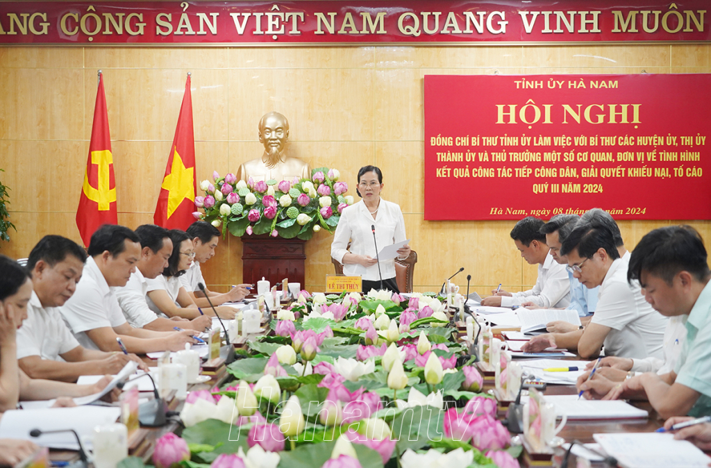 Chiều 8/10, đồng chí Lê Thị Thủy, Ủy viên Trung ương Đảng, Bí Thư Tỉnh ủy, Chủ tịch HĐND tỉnh chủ trì hội nghị làm việc với Bí thư các huyện ủy, thị ủy, thành ủy và thủ trưởng một số cơ quan, đơn vị về tình hình kết quả công tác tiếp công dân, giải quyết khiếu nại, tố cáo (KNTC) và xử lý các kiến nghị, phản ánh của công dân trên địa bàn tỉnh quý III/2024.