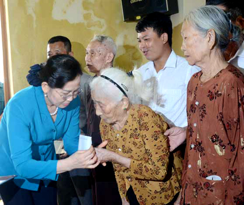 Đồng chí Bí thư Tỉnh ủy Lê Thị Thủy tặng quà các hộ gia đình chính sách xã Chính Lý.