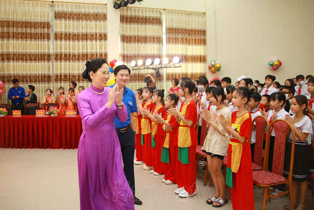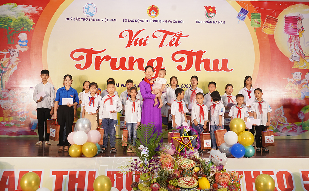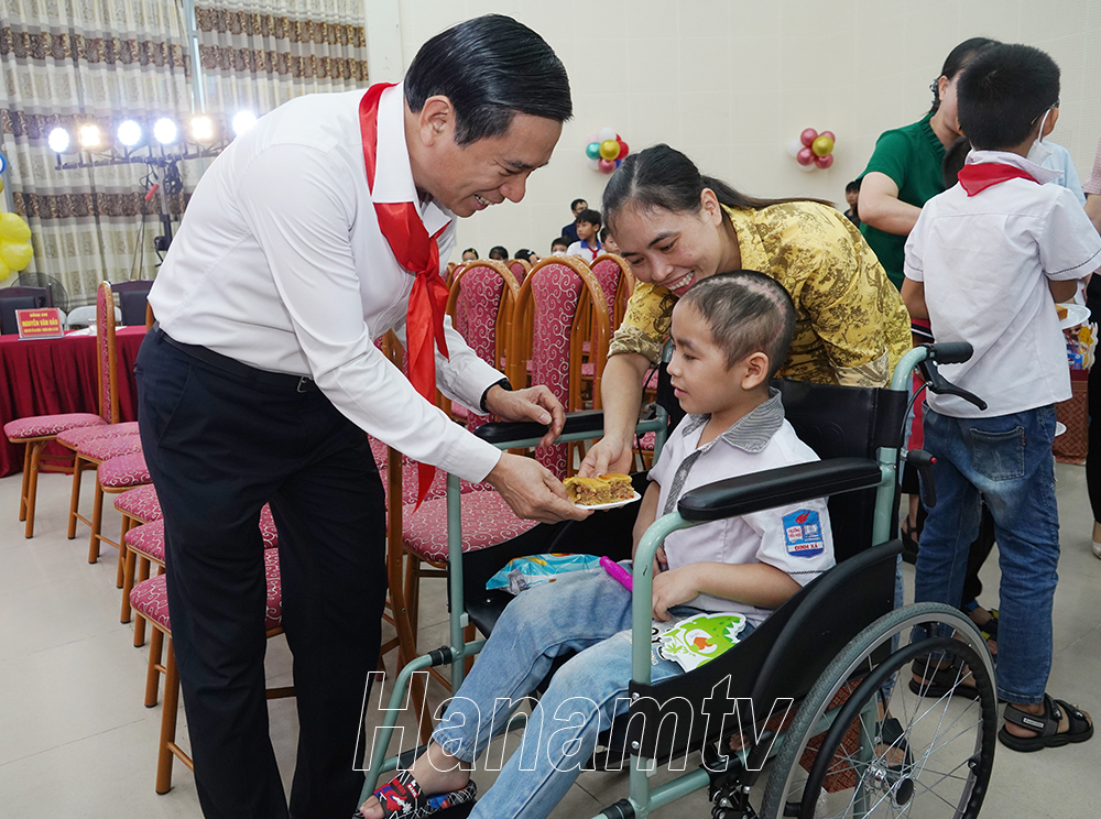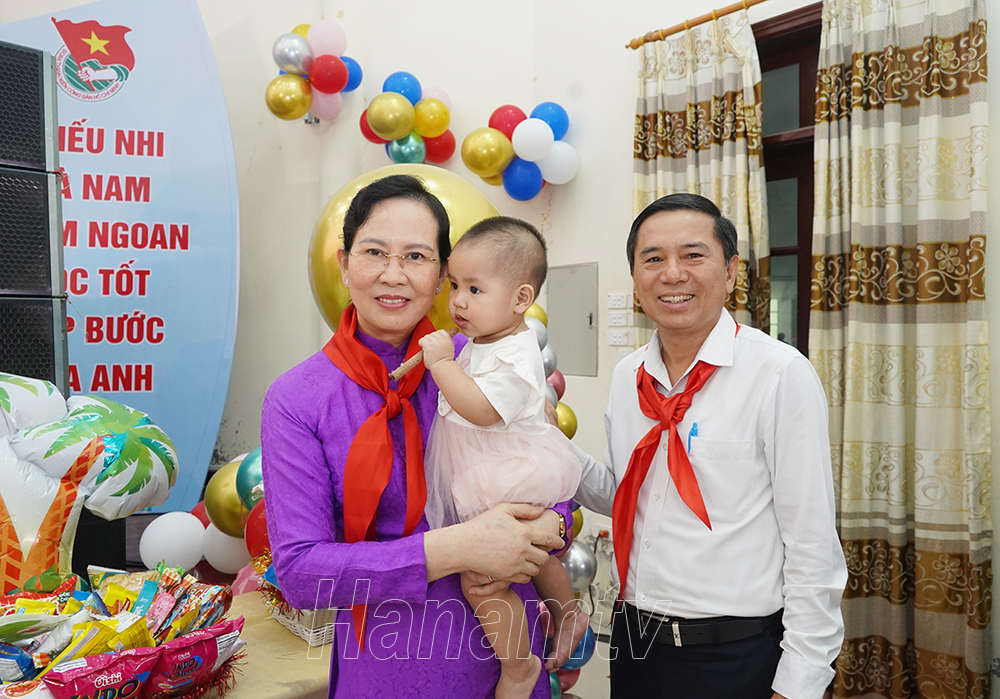 Đồng chí Lê Thị Thủy, Ủy viên Trung ương Đảng, Bí thư Tỉnh ủy, Chủ tịch HĐND tỉnh tới dự và chung vui với các em thiếu nhiĐồng chí Bí thư Tỉnh ủy Lê Thị Thủy và đồng chí Phó Chủ tịch UBND tỉnh Trần Xuân Dưỡng tặng quà, chụp ảnh với cháu Quỳnh Anh đang được nuôi dưỡng, chăm sóc tại Trung tâm công tác xã hội tỉnh Hà Nam. Cháu bé đã được đồng chí Bí thư Tỉnh ủy nhận đỡ đầu từ tháng 6/2023.