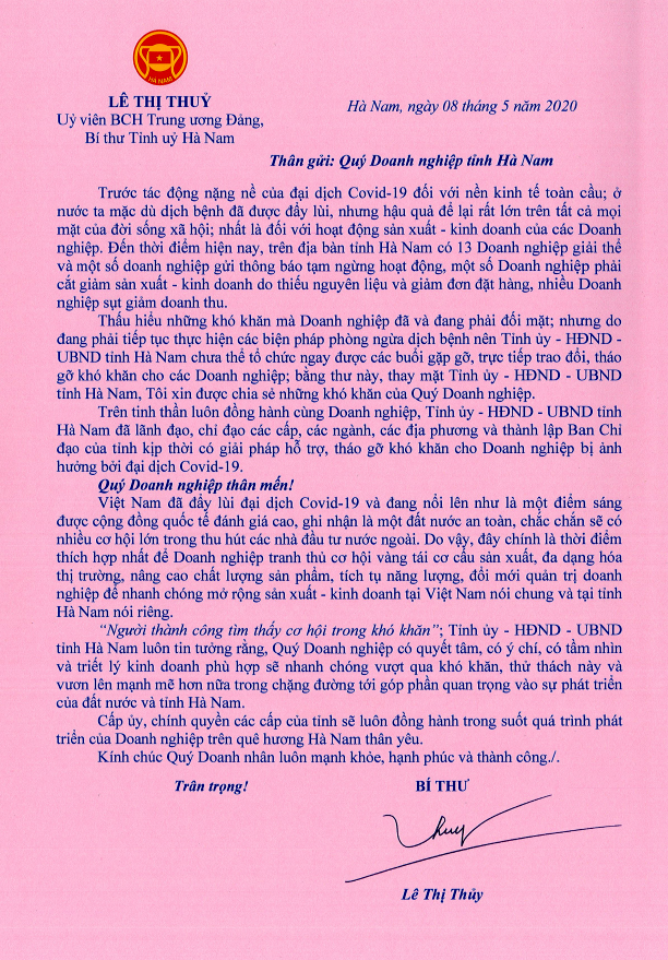 Đồng chí Bí thư Tỉnh ủy Lê Thị Thủy gửi thư khích lệ, động viên cộng đồng doanh nghiệp trên địa bàn tỉnh