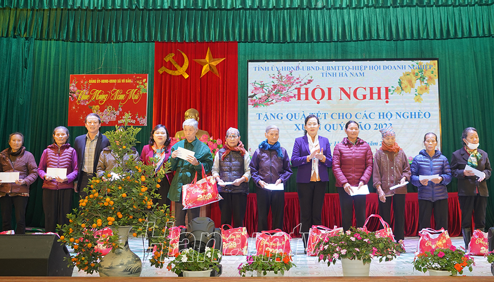 Phát biểu tại chương trình tặng quà tết cho các hộ nghèo xã Vũ Bản, đồng chí Bí thư Tỉnh ủy Lê Thị Thủy nhấn mạnh, mỗi dịp tết đến, xuân về, cấp ủy, chính quyền, MTTQ và các doanh nghiệp đều dành sự quan tâm, chăm lo tết đến các gia đình chính sách, hộ có hoàn cảnh khó khăn trên địa bàn tỉnh. Dù những món quà trao tặng giá trị không lớn, song đồng chí Bí thư Tỉnh ủy mong muốn thông qua đó sẽ động viên kịp thời, đưa không khí xuân về với các gia đình còn khó khăn trong dịp tết.