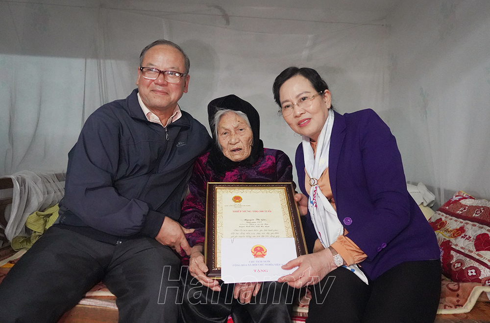 Nhân dịp này, đồng chí Bí thư Tỉnh ủy Lê Thị Thủy đã đến thăm, chúc thọ, tặng quà của Nhà nước và của tỉnh cho cụ Nguyễn Thị Gái năm nay tròn 100 tuổi tại thôn Liễm, xã Vũ Bản.