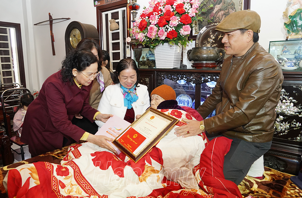 Đồng chí Bí thư Tỉnh ủy Lê Thị Thủy thăm, chúc Tết, trao tặng quà của Chủ tịch nước, quà Tết của tỉnh cho cụ bà Phạm Thị Nguyên, mẹ liệt sỹ tròn 100 tuổi tại Tổ dân phố 4, Thị trấn Hòa Mạc