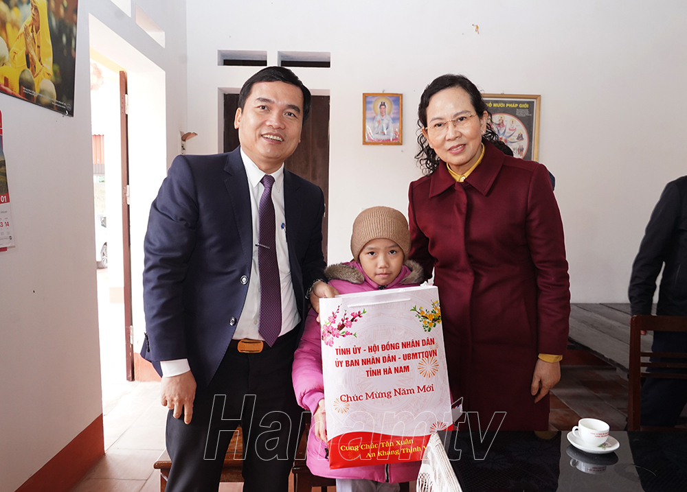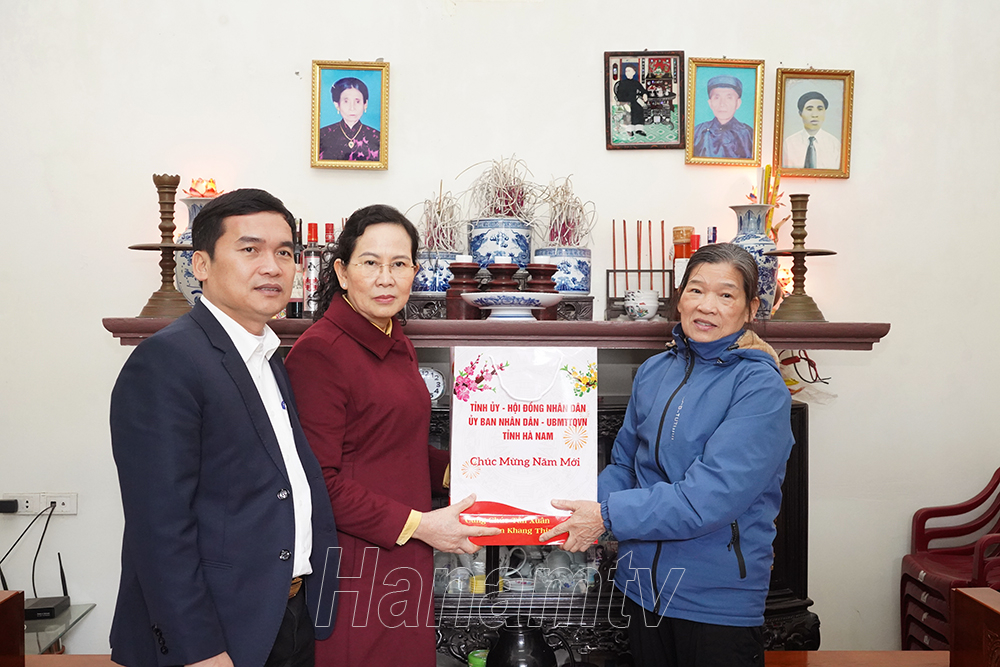 Cũng trong sáng nay, đồng chí Bí thư Tỉnh ủy Lê Thị Thủy đã tới thăm, chúc Tết, trao tặng quà của Chủ tịch nước, quà Tết của tỉnh cho cụ bà Phạm Thị Nguyên, mẹ liệt sỹ tròn 100 tuổi tại Tổ dân phố 4, Thị trấn Hòa Mạc; tặng quà cháu Phạm Vũ Trang Hòa là trẻ mồ côi đang được nuôi dưỡng tại Chùa Đông Ngoại, phường Châu Giang; gia đình thương binh hạng 4/4 Trần Đức Mỹ tại Tổ dân phố Đồng Văn, phường Đồng Văn và gia đình bà Lê Thị Tuệ là hộ nghèo có hoàn cảnh khó khăn tại Tổ dân phố Trung, phường Duy Minh.