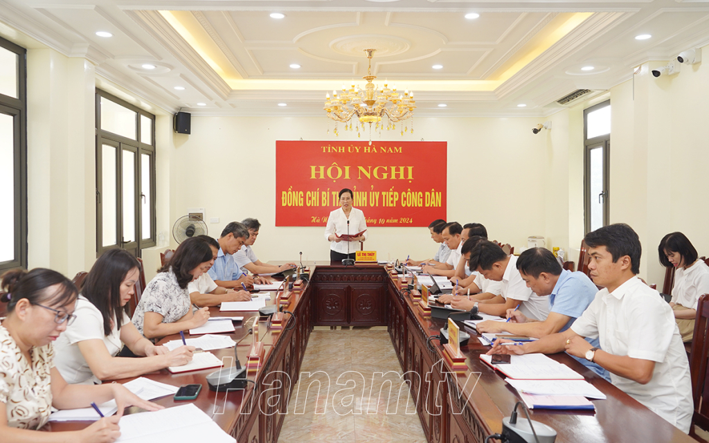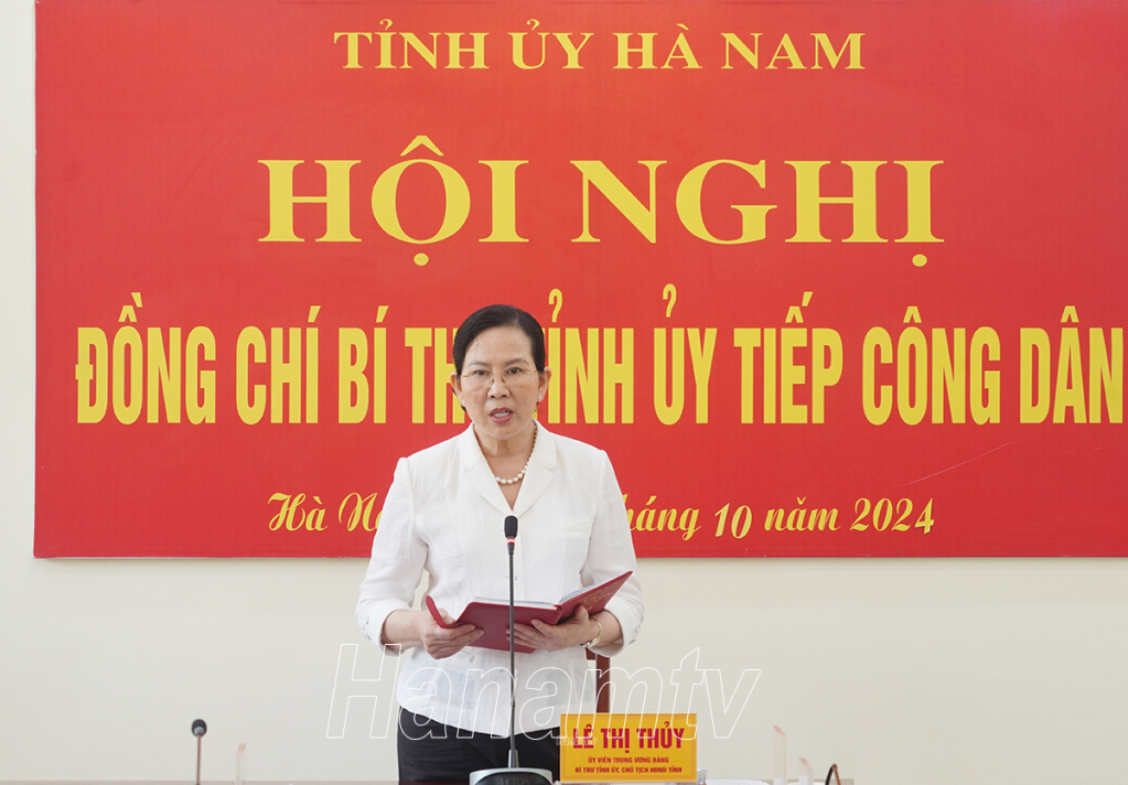 Sáng 22/10, đồng chí Lê Thị Thủy, Ủy viên Trung ương Đảng, Bí thư Tỉnh ủy, Chủ tịch HĐND tỉnh chủ trì buổi tiếp công dân định kỳ tháng 10/2024. Cùng dự có đồng chí Trần Xuân Dưỡng, Tỉnh ủy viên, Phó Chủ tịch UBND tỉnh; đại diện Văn phòng Tỉnh ủy, Văn phòng Đoàn ĐBQH và HĐND tỉnh, Văn phòng UBND tỉnh, Ban Nội chính Tỉnh ủy, Ban Pháp chế HĐND tỉnh, Thanh tra tỉnh, Sở Tài nguyên và Môi trường, UBND thành phố Phủ Lý, xã Liêm Chung.