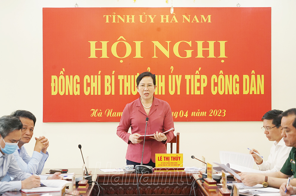 Sáng 26/4, đồng chí Lê Thị Thủy, Ủy viên TW Đảng, Bí thư Tỉnh ủy, Chủ tịch HĐND tỉnh tiếp công dân định kỳ tháng 4/2023. Cùng dự buổi tiếp có các đồng chí: Đào Đình Tùng, Ủy viên BTV Tỉnh ủy, Trưởng Ban Nội chính Tỉnh ủy; Lường Văn Thắng, Ủy viên BTV Tỉnh ủy, Chỉ huy trưởng Bộ CHQS tỉnh; Trần Xuân Dưỡng, Tỉnh ủy viên, Phó Chủ tịch UBND tỉnh; lãnh đạo Ban Dân vận Tỉnh ủy, Ban Nội chính Tỉnh ủy, Ban Pháp chế HĐND tỉnh; Thanh tra tỉnh; Văn phòng Tỉnh ủy, Văn phòng UBND tỉnh; Văn phòng Đoàn ĐBQH&HĐND tỉnh; Sở LĐTB&XH; lãnh đạo UBND huyện Thanh Liêm và xã Thanh Tân.