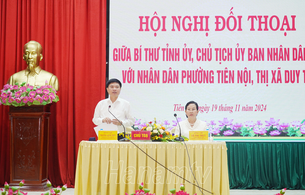 Sáng 19/11, đồng chí Lê Thị Thủy, Ủy viên Trung ương Đảng, Bí thư Tỉnh ủy, Chủ tịch HĐND tỉnh và đồng chí Trương Quốc Huy, Phó Bí thư Tỉnh ủy, Chủ tịch UBND tỉnh, Trưởng Đoàn đại biểu Quốc hội tỉnh đối thoại với nhân dân phường Tiên Nội, thị xã Duy Tiên.