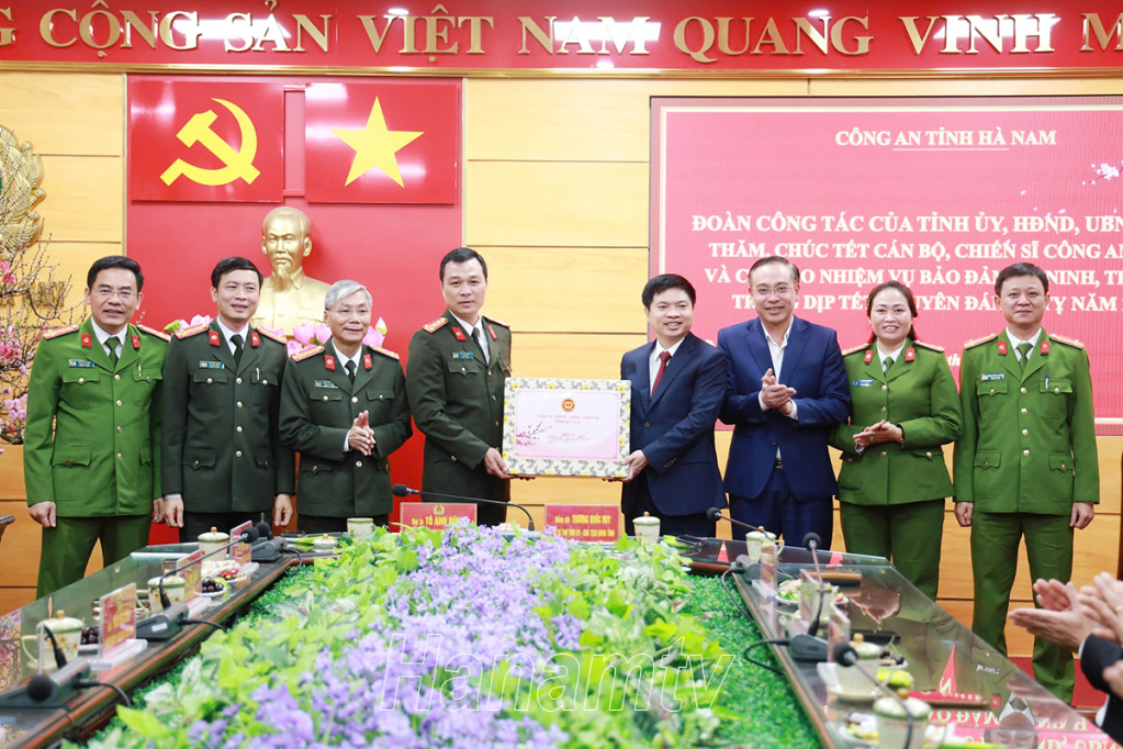 Đồng chí Trương Quốc Huy, Phó Bí thư Tỉnh ủy, Chủ tịch UBND tỉnh, Trưởng Đoàn đại biểu Quốc hội tặng quà, chúc Tết cán bộ, chiến sỹ Công an tỉnh Hà Nam.