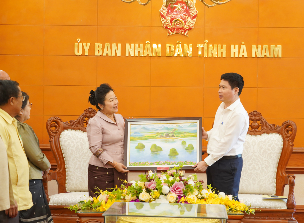 Nhân dịp này, đoàn công tác của Trung ương Liên hiệp Công đoàn Lào đã tặng quà lưu niệm cho UBND tỉnh Hà Nam. Thay mặt UBND tỉnh, đồng chí Chủ tịch Trương Quốc Huy đã tặng đồng chí Aly Vong No Bun Thăm và đoàn công tác bức tranh vẽ Khu du lịch Quốc gia Tam Chúc của tỉnh Hà Nam.