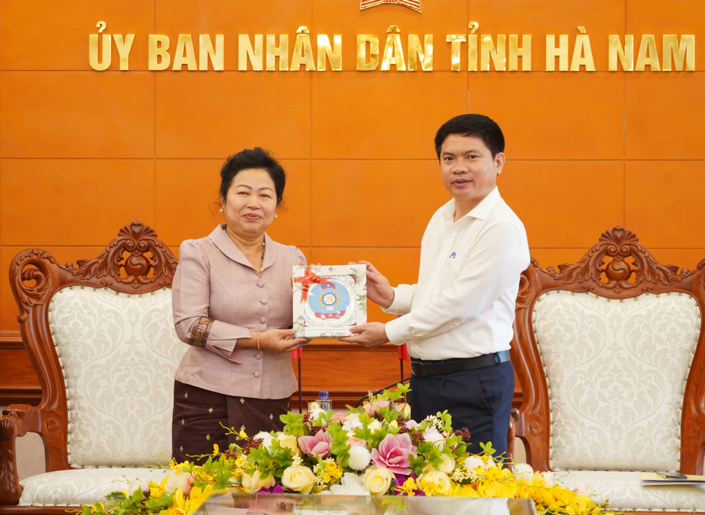 Đồng chí Aly Vông Nor Bun Thăm, Ủy viên TW Đảng Nhân dân Cách mạng Lào, Chủ tịch Trung ương Liên hiệp Công đoàn Lào trao tặng quà lưu niệm cho UBND tỉnh Hà Nam