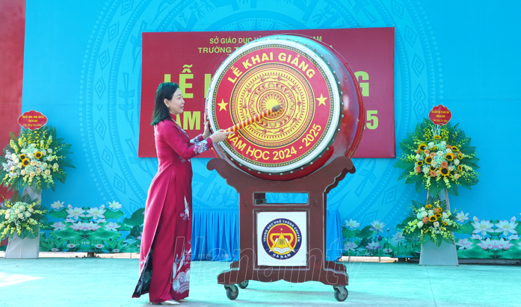 Đồng chí Phó Bí thư Thường trực Tỉnh ủy Đinh Thị Lụa đánh trống khai giảng năm học mới tại Trường THPT Chuyên Biên Hòa
