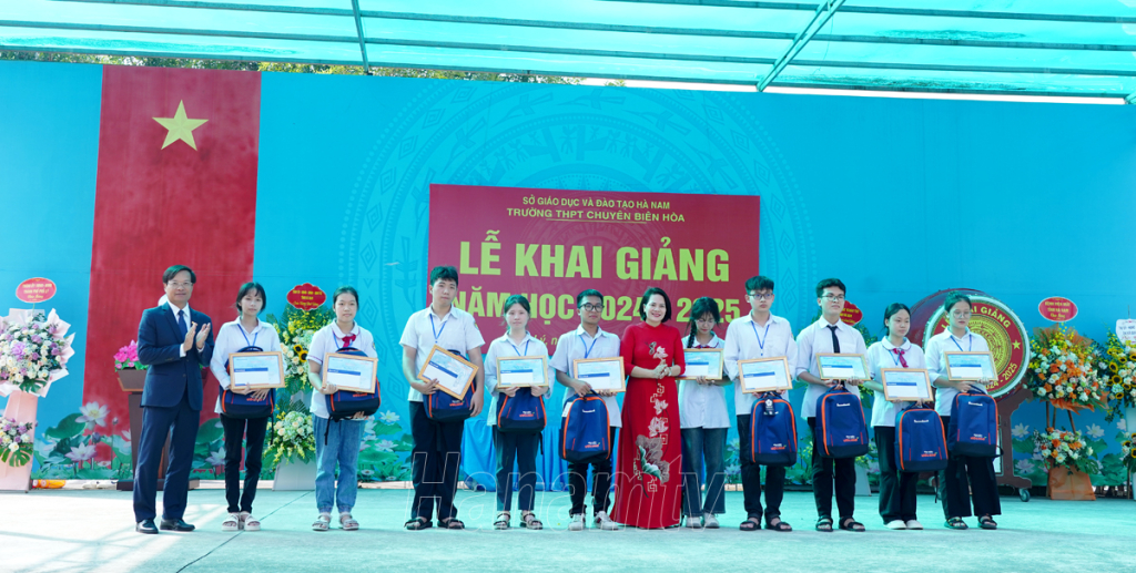 Lãnh đạo Trường THPT chuyên Biên Hòa cùng đại diện Sacombank chi nhánh Hà Nam trao học bổng cho các em học sinh