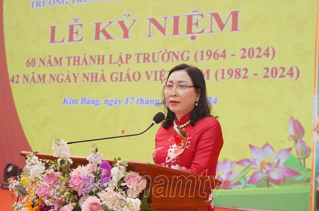 Phát biểu tại lễ kỷ niệm, đồng chí Phó Bí thư Thường trực Tỉnh ủy Đinh Thị Lụa bày tỏ sự xúc động và tự hào khi nhìn lại chặng đường phát triển và những thành tựu mà Trường THPT A Kim Bảng đã đạt được trong suốt 60 năm qua. Với vai trò là cựu học sinh, cựu giáo viên đã từng học tập và công tác dưới mái trường này, đồng chí Phó Bí thư Thường trực Tỉnh ủy gửi lời tri ân sâu sắc và lời chúc mừng tốt đẹp nhất tới các thế hệ cán bộ, giáo viên, nhân viên, học sinh Trường THPT A Kim Bảng qua các thời kỳ.