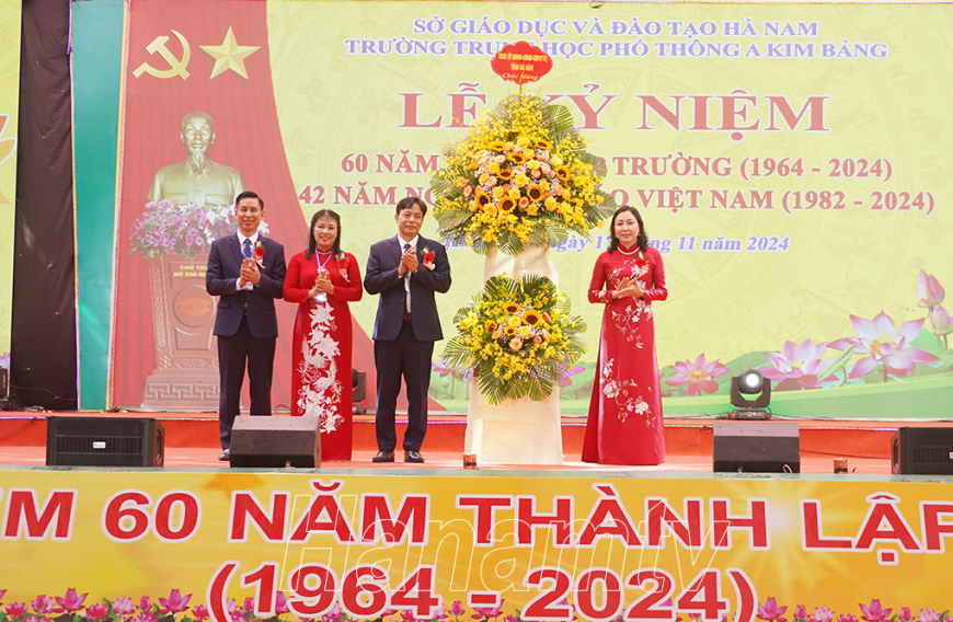 Sáng 17/11, Trường THPT A Kim Bảng long trọng tổ chức Lễ kỷ niệm 60 năm Ngày thành lập trường (1964 - 2024), 42 năm Ngày Nhà giáo Việt Nam (1982 - 2024). Dự lễ kỷ niệm có các đồng chí: Đinh Thị Lụa, Phó Bí thư Thường trực Tỉnh ủy; Lê Văn Tân, nguyên Phó Bí thư Thường trực Tỉnh ủy, nguyên Trưởng Đoàn đại biểu Quốc hội tỉnh; lãnh đạo Sở Giáo dục và Đào tạo (GD&ĐT), huyện Kim Bảng cùng các thế hệ cán bộ, giáo viên, học sinh nhà trường qua các thời kỳ.