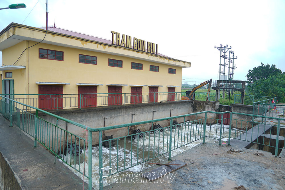 Đồng chí Phó Bí thư Thường trực kiểm tra công trình Trạm bơm Bùi II hiện đang thi công.Trạm bơm Bùi I đang vận hành hết công suất các tổ máy bơm để bơm tiêu úng sau những trận mưa lớn ngày 5/6.