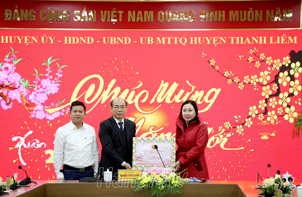 Đồng chí Đinh Thị Lụa, Phó Bí thư Thường trực Tỉnh ủy tặng quà, chúc Tết, động viên Đảng bộ, chính quyền và nhân dân huyện Thanh Liêm nhân dịp đầu xuân mới.