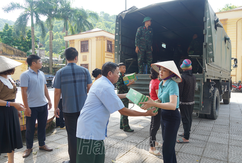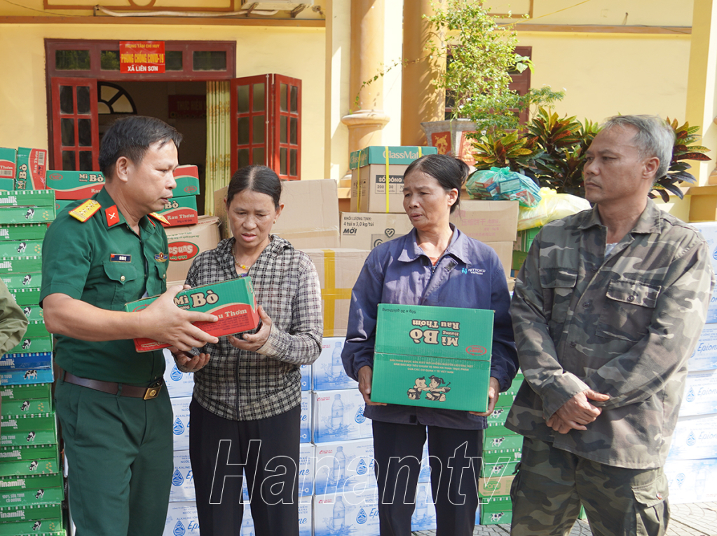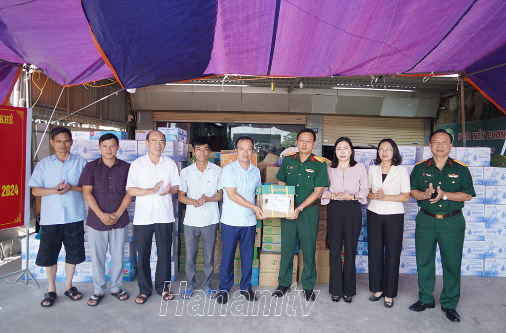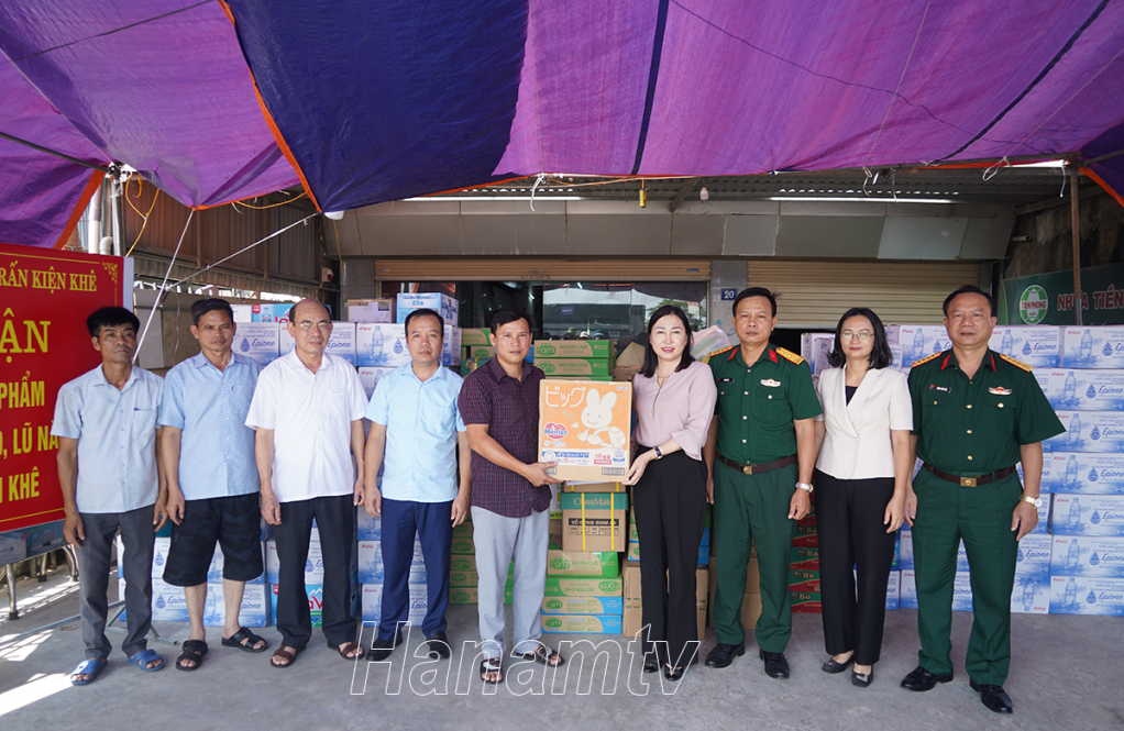 Đồng chí Đinh Thị Lụa, Phó Bí thư Thường trực Tỉnh ủy trao quà ủng hộ cho nhân dân thị trấn Kiện Khê, huyện Thanh Liêm.Đại tá Vũ Văn Tự, Phó Chủ nhiệm chính trị - Bộ CHQS tỉnh trao tặng quà ủng hộ cho nhân dân thị trấn Kiện Khê.