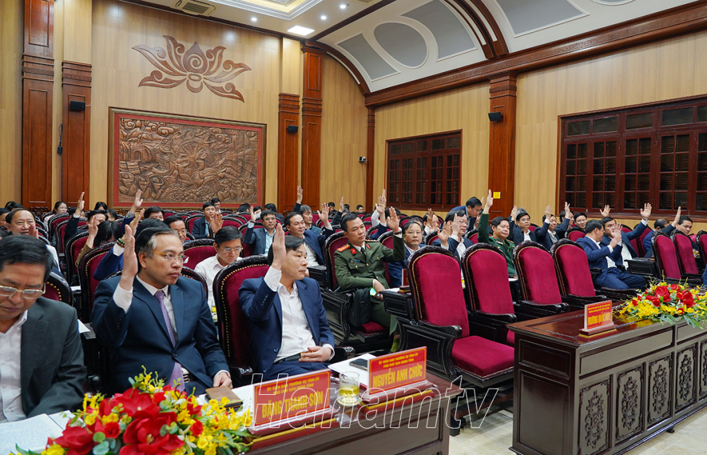 Các đại biểu dự hội nghị biểu quyết thông qua biên bản bầu chức danh Bí thư Tỉnh ủy khóa XX, nhiệm kỳ 2020 - 2025.