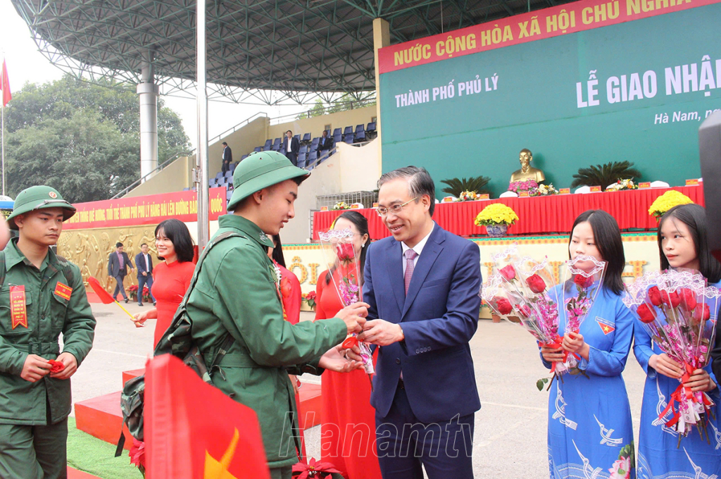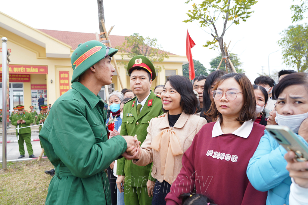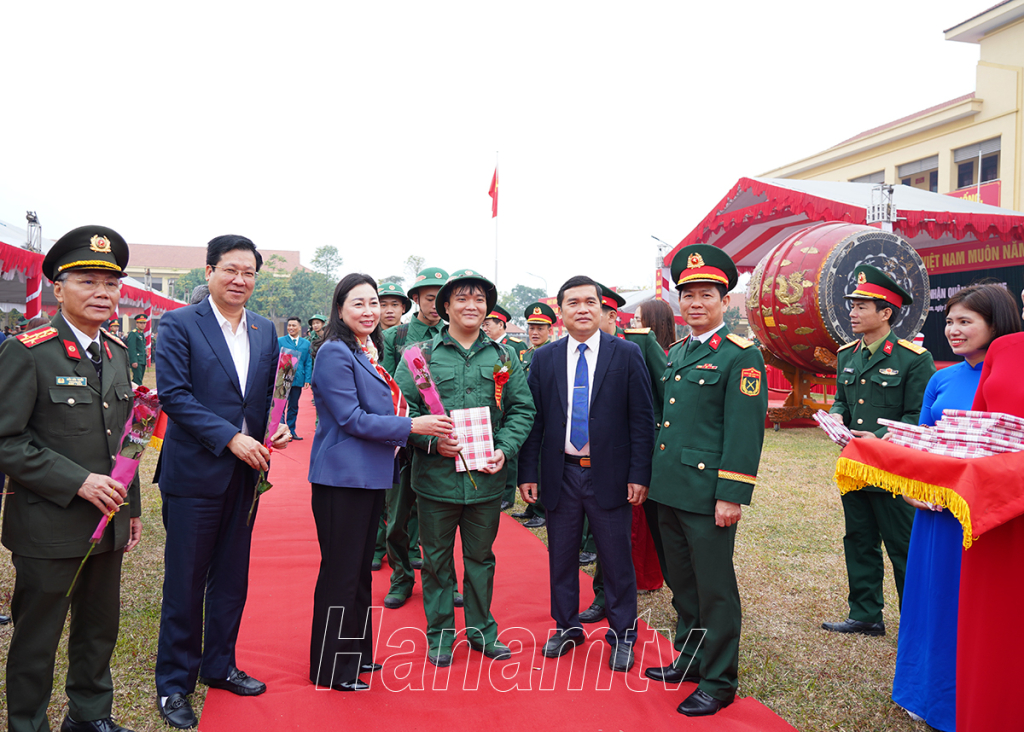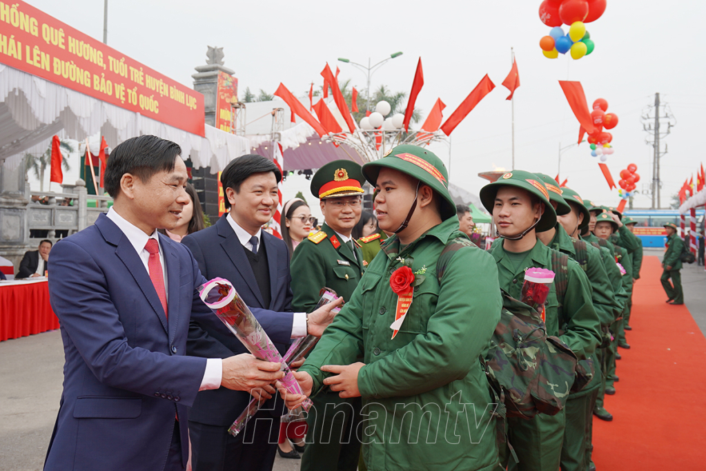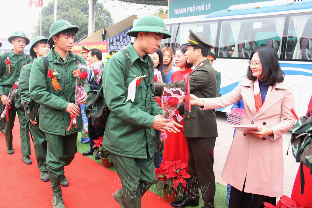 Đồng chí Nguyễn Đức Vượng, Tỉnh ủy viên, Phó Chủ tịch UBND tỉnh tặng hoa, động viên các tân binh huyện Lý Nhân.Đồng chí Bùi Văn Hoàng, Tỉnh ủy viên, Bí thư Huyện ủy Lý Nhân tặng hoa, động viên các tân binh huyện nhà phát huy truyền thống của quê hương, hoàn thành xuất sắc nhiệm vụ trong quân ngũ.Đồng chí Trương Công Khải, Tỉnh ủy viên, Bí thư Huyện ủy Bình Lục tặng hoa, động viên các tân binh.