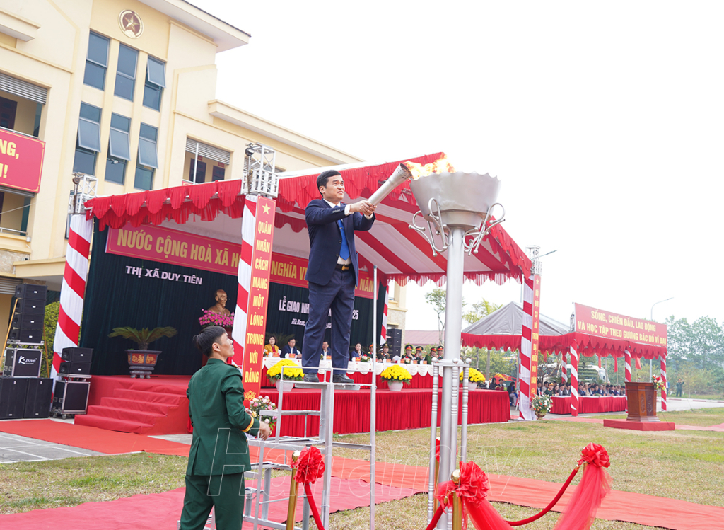 Ngay từ sáng sớm, tại sân của Ban CHQS thị xã Duy Tiên đã rộn ràng không khí của ngày hội giao, nhận quân. Hàng trăm người dân đã đến động viên, dặn dò con em là tân binh trước khi về các đơn vị quân đội, công an. Thay mặt lãnh đạo tỉnh, đồng chí Đinh Thị Lụa, Phó Bí thư Thường trực Tỉnh ủy đã đến dự buổi lễ và động viên 253 tân binh của thị xã Duy Tiên trước khi lên đường thực hiện nghĩa vụ của công dân đối với Tổ quốc.