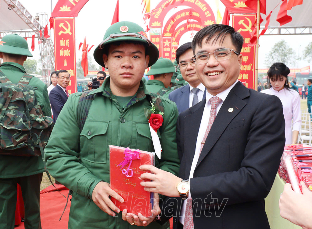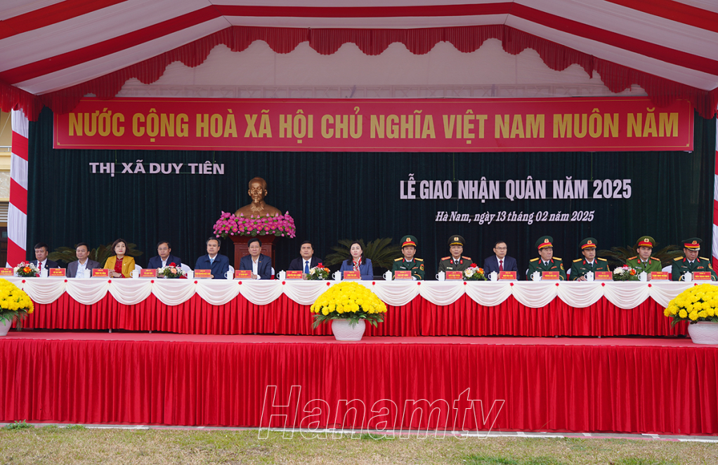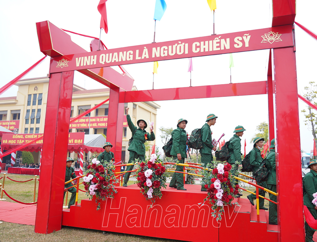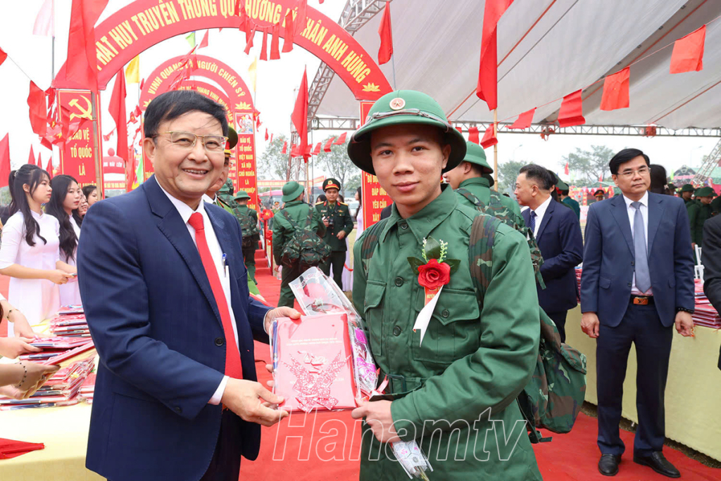 Đồng chí Phó Bí thư Thường trực Tỉnh ủy và các đồng chí lãnh đạo tỉnh, lãnh đạo thị xã Duy Tiên tặng hoa, động viên các tân binh trước khi lên đường nhập ngũ.Đồng chí Chủ tịch UBND tỉnh tặng hoa, động viên, dặn dò các tân binh huyện Thanh Liêm phát huy truyền thống của quê hương, nỗ lực tu dưỡng, rèn luyện, hoàn thành xuất sắc nhiệm vụ Đảng, Nhà nước và Quân đội giao cho.