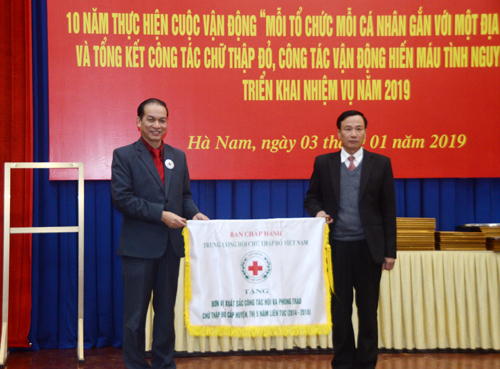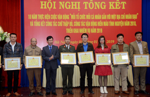 Lãnh đạo TW Hội chữ thập đỏ Việt Nam trao cờ thi đua và bằng khen cho các tập thể, cá nhân có thành tích xuất sắc trong thực hiện CVĐ “Mỗi tổ chức cá nhân gắn với một địa chỉ đỏ nhân đạo”, và công tác vận động hiến máu tình nguyện năm 2018