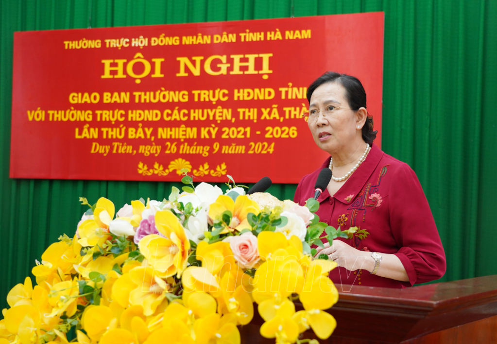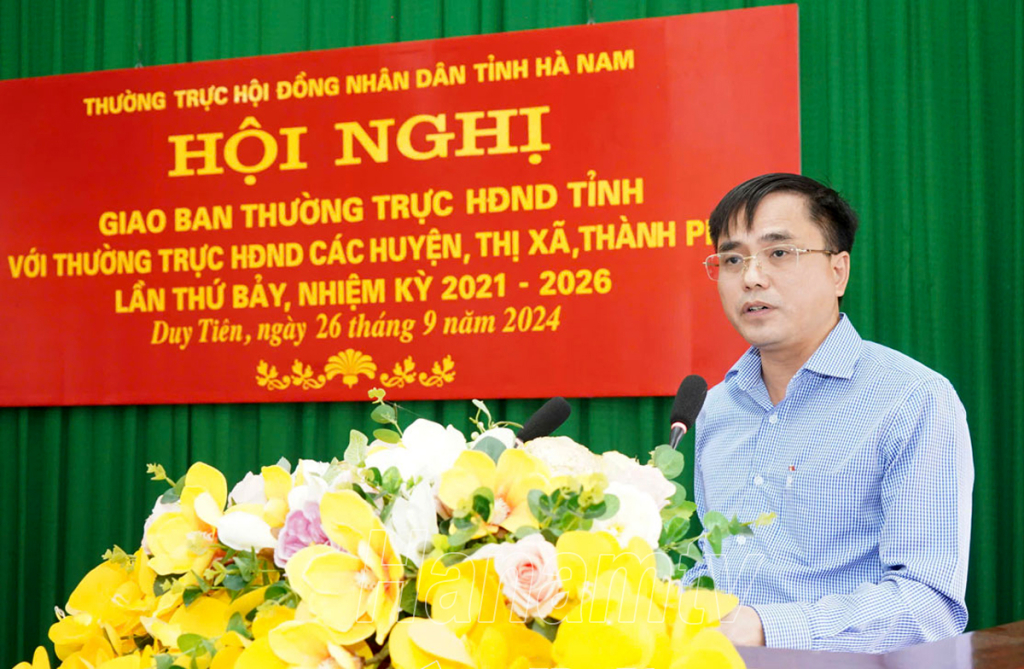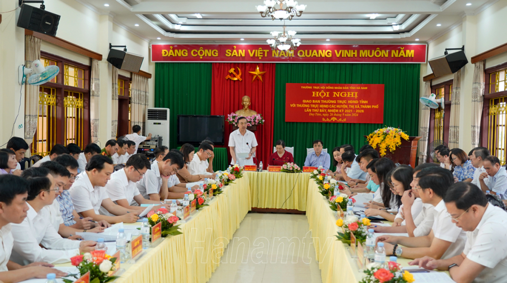 Chiều 26/9, tại thị xã Duy Tiên, Thường trực HĐND tỉnh tổ chức hội nghị giao ban với Thường trực HĐND các huyện, thị xã, thành phố lần thứ 7, nhiệm kỳ 2021 - 2026 đánh giá tình hình thực hiện các nhiệm vụ của của HĐND tỉnh, HĐND các huyện, thị xã, thành phố 9 tháng đầu năm 2024; thảo luận chuyên đề "Kinh nghiệm và giải pháp nâng cao chất lượng hoạt động giám sát việc thực hiện cơ chế, chính sách đó HĐND tỉnh ban hành". Đồng chí Lê Thị Thủy, Ủy viên Trung ương Đảng, Bí thư Tỉnh ủy, Chủ tịch HĐND tỉnh và các đồng chí Phó Chủ tịch HĐND tỉnh chủ trì hội nghị.