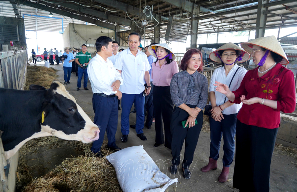 Các đại biểu tham quan mô hình chăn nuôi bò sữa của xã Mộc Bắc, thị xã Duy Tiên.