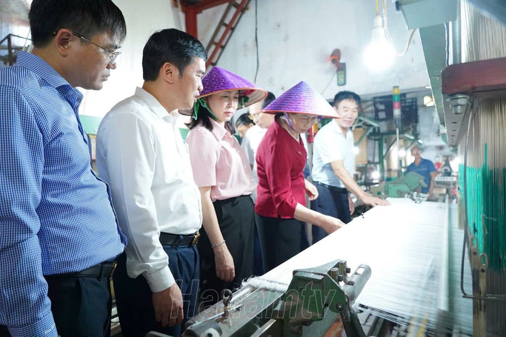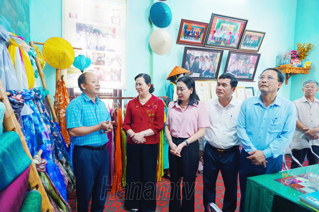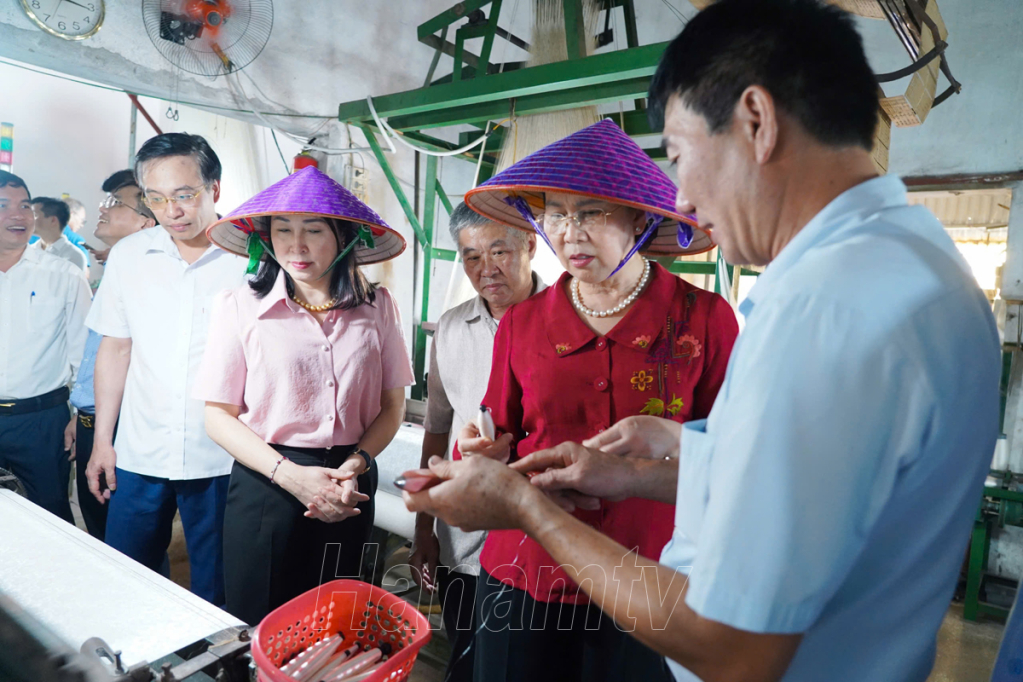 Các đồng chí lãnh đạo tỉnh tham quan làng nghề dệt lụa Nha Xá, xã Mộc Nam, thị xã Duy Tiên.