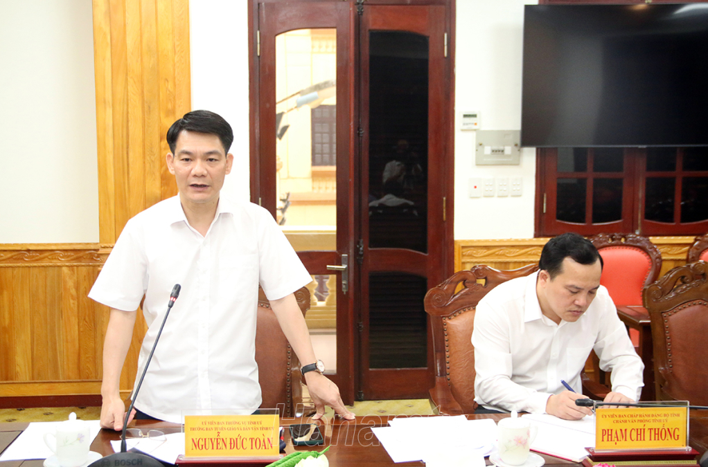 Đồng chí Nguyễn Đức Toàn, Ủy viên BTV Tỉnh ủy, Trưởng Ban Tuyên giáo và Dân vận Tỉnh ủy phát biểu tại hội nghị.