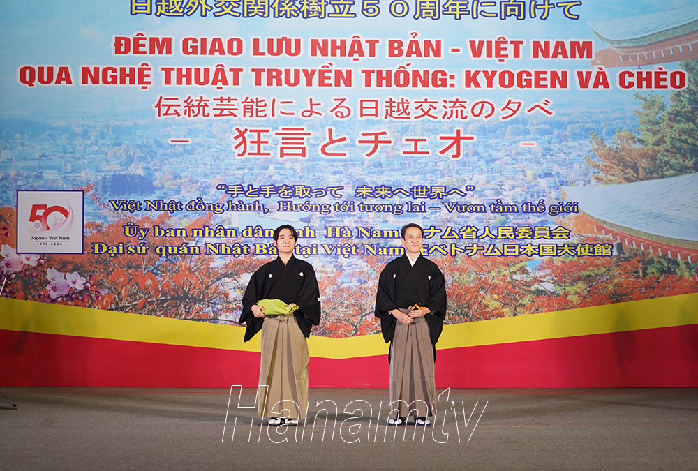 Cha con nghệ sĩ hài kịch Kyogen OGASAWARA Tadashi và Hiroaki giới thiệu với khán giả Hà Nam bộ môn nghệ thuật truyền thống Kyogen có bề dày truyền thống 650 năm lịch sử của Nhật BảnNghệ thuật hài kịch Kyogen của Nhật Bản đã được UNESCO công nhận là di sản văn hóa thế giới.