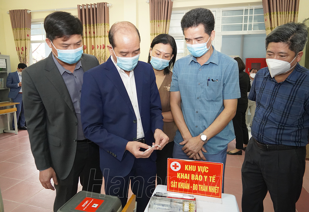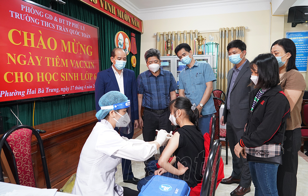 Lãnh đạo Sở Y tế và lãnh đạo Thành phố Phủ Lý kiểm tra công tác tổ chức tiêm chủng cho học sinh lớp 6 tại điểm tiêm Trường THCS Trần Quốc Toản.