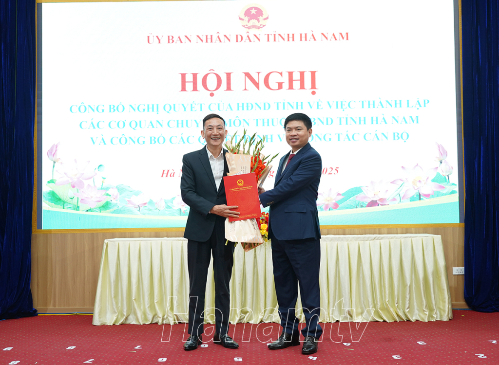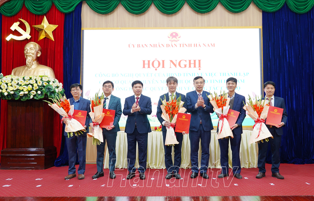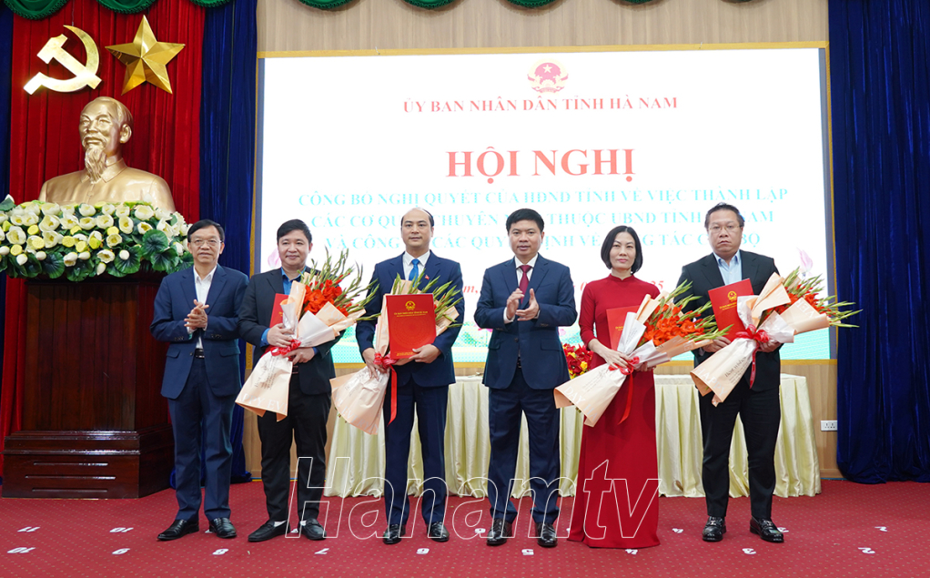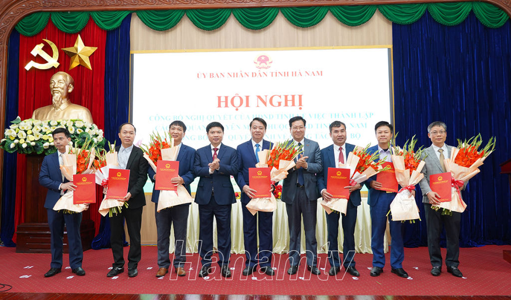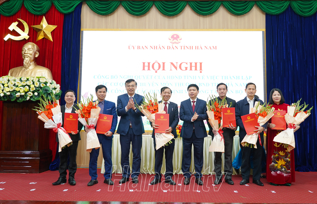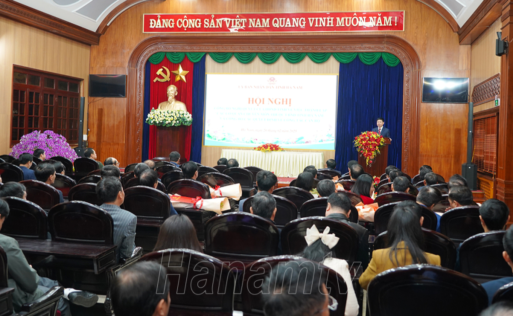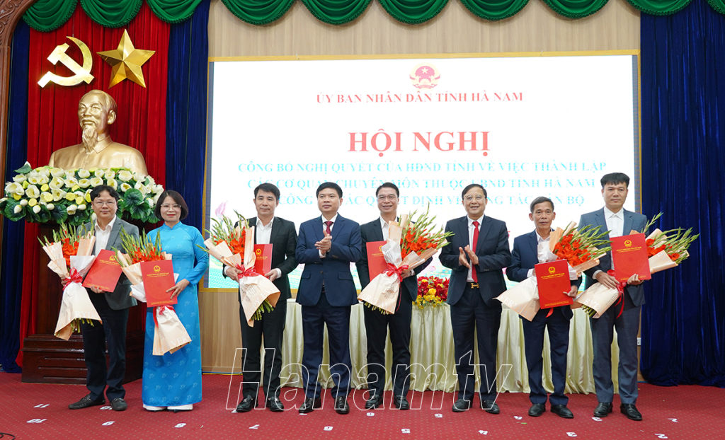 Hội nghị đã công bố Nghị quyết của HĐND tỉnh Hà Nam về việc thành lập các cơ quan chuyên môn thuộc UBND tỉnh được thông qua tại Kỳ họp thứ 23 (Kỳ họp chuyên đề); công bố các quyết định của Chủ tịch UBND tỉnh điều động, bổ nhiệm đối với cán bộ lãnh đạo của các sở ngành thành lập, tổ chức lại gồm: Sở Xây dựng (trên cơ sở hợp nhất Sở Xây dựng và Sở Giao thông – Vận tải); Sở Khoa học và Công nghệ (trên cơ sở hợp hợp nhất Sở Khoa học và Công nghệ và Sở Thông tin và Truyền thông); Sở Tài chính (trên cơ sở hợp nhất Sở Tài chính và Sở Kế hoạch và Đầu tư); Sở Nông nghiệp và Môi trường (trên cơ sở hợp nhất Sở Nông nghiệp và Phát triển nông thôn và Sở Tài nguyên và Môi trường); Sở Nội vụ (trên cơ sở hợp nhất Sở Nội vụ và Sở Lao động, Thương binh và Xã hội); quyết định bổ nhiệm các lãnh đạo Sở Văn hóa, Thể thao và Du lịch.
