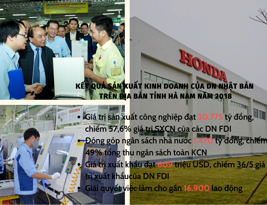 Theo báo cáo của UBND tỉnh Hà Nam, toàn tỉnh hiện có 78 dự án đầu tư của DN Nhật Bản còn hiệu lực, trong đó có 62 dự án đã đi vào hoạt động, với tổng vốn đầu tư 767 triệu USD, chiếm 29,87 % tổng vốn FDI đầu tư vào tỉnh. Riêng trong năm 2018, tỉnh đã thu hút được 15 dự án đầu tư của Nhật với tổng vốn đầu tư hơn 164 triệu USD.