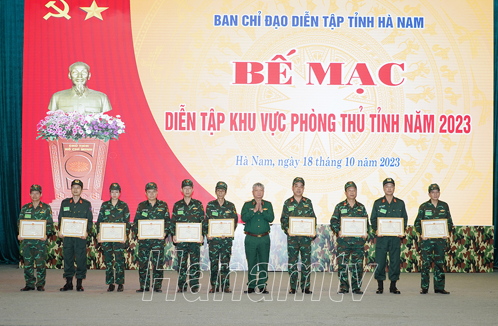 Trung tướng Nguyễn Quang Ngọc thay mặt Bộ Tư lệnh Quân khu 3 tặng bằng khen cho 7 tập thể, 7 cá nhân có thành tích xuất sắc trong diễn tập, phục vụ diễn tập khu vực phòng thủ tỉnh Hà Nam năm 2023.