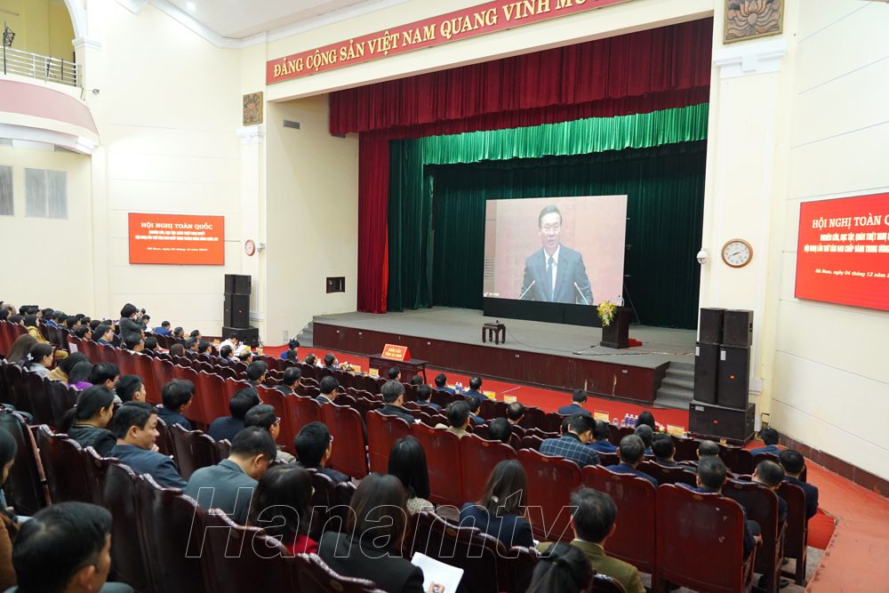 Chủ tịch nước Võ Văn Thưởng truyền đạt Nghị quyết số 43-NQ/TW của BCH Trung ương Đảng về “Tiếp tục phát huy truyền thống, sức mạnh đại đoàn kết toàn dân tộc, xây dựng đất nước ta ngày càng phồn vinh, hạnh phúc” (Ảnh: Báo QĐND)Toàn cảnh hội nghị tại điểm cầu Nhà văn hóa trung tâm tỉnh Hà Nam
