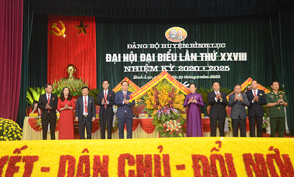 Thường trực Tỉnh ủy Hà Nam tặng hoa chúc mừng Đại hội Công tác xây dựng Đảng và các tổ chức trong hệ thống chính trị tiếp tục được chú trọng, đổi mới cả nội dung và hình thức. Đảng bộ huyện đã tập trung lãnh đạo, chỉ đạo sắp xếp tổ chức bộ máy của hệ thống chính trị tinh gọn, hoạt động hiệu lực, hiệu quả theo Nghị quyết Trung ương 6 (khoá XII), Chương trình hành động số 54- CTr/TU, ngày 31/01/2018 của Tỉnh ủy gắn với tinh giản biên chế theo Nghị quyết 39- NQ/TW của Bộ Chính trị. Từng bước tinh gọn hệ thống chính trị ở cơ sở; sắp xếp, sáp nhập các đơn vị hành chính cấp xã và thôn, xóm, tiểu khu theo lộ trình.