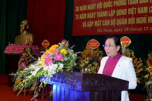 Đồng chí Bí thư Tỉnh ủy Lê Thị Thủy cho rằng: Kỷ niệm 30 năm Ngày hội Quốc phòng toàn dân và 75 năm Ngày thành lập Quân đội nhân dân Việt Nam là dịp để chúng là ôn lại lịch sử hào hùng, những chiến công oanh liệt của quân đội và nhân dân ta. Qua đó, khơi dậy niềm tự hào, tự tôn dân tộc, nâng cao tinh thần yêu nước, ý chí tự lực, tự cường, ra sức xây dựng nền quốc phòng toàn dân vững mạnh, xây dựng thế trận quốc phòng toàn dân gắn với thế trận an ninh nhân dân ngày càng vững chắc, góp phần thực hiện thắng lợi công cuộc đổi mới đất nước, xây dựng tỉnh Hà Nam ngày càng phát triển nhanh, bền vững.