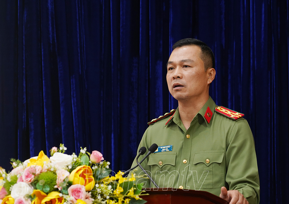 Đại tá Tô Anh Dũng, Ủy viên Ban Thường vụ Tỉnh ủy, Giám đốc Công an tỉnh, Tổ phó thường trực Tổ công tác triển khai Đề án 06 tỉnh phát biểu tại hội nghị.