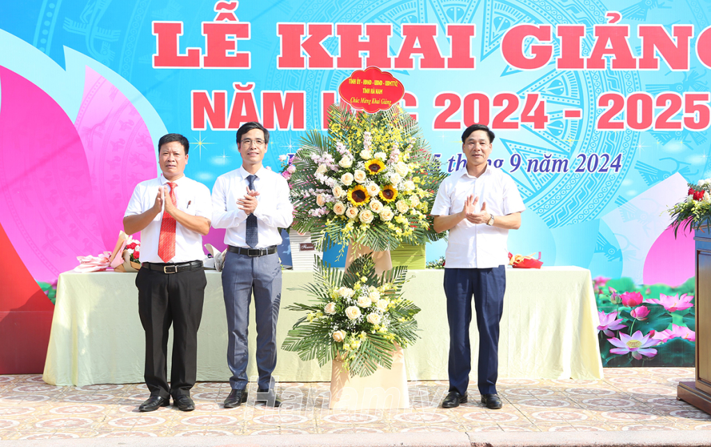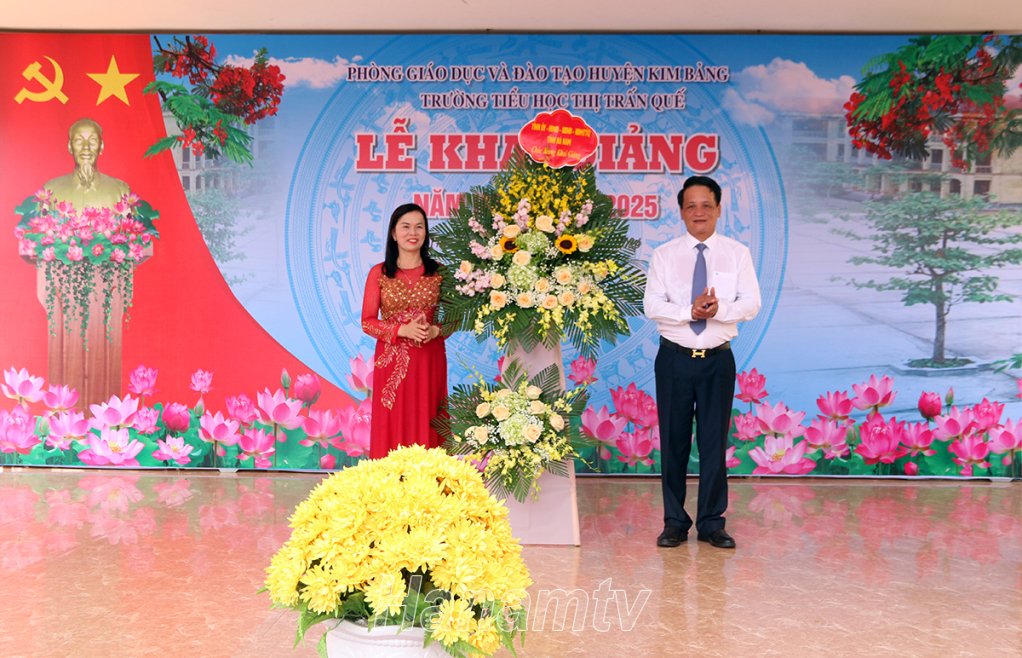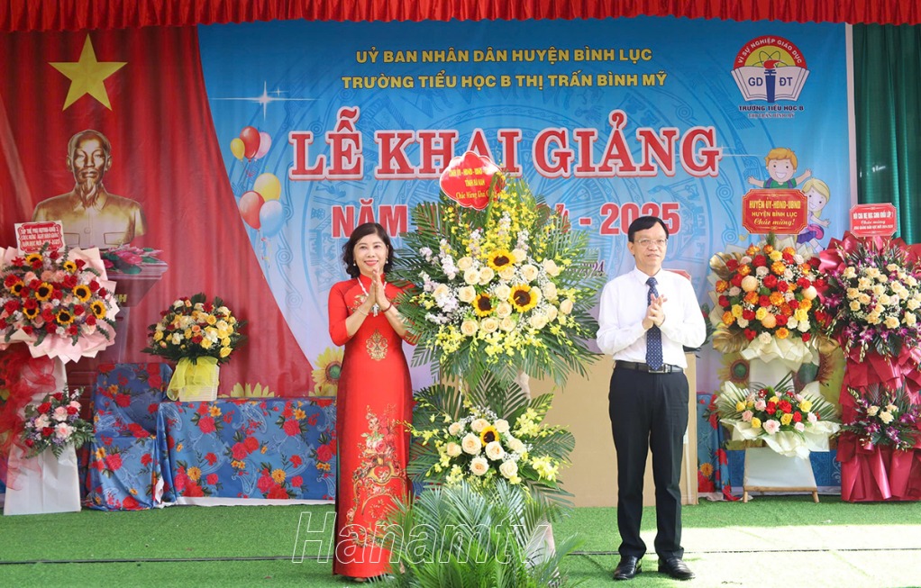 Đồng chí Đặng Đình Thoảng, Ủy viên BTV Tỉnh ủy, Trưởng Ban Tổ chức Tỉnh ủy tặng hoa chúc mừng lễ khai giảng tại Trường tiểu học B, thị trấn Bình Mỹ, huyện Bình Lục.Đồng chí Đào Đình Tùng, Ủy viên BTV Tỉnh ủy, Trưởng Ban Nội chính Tỉnh ủy tặng hoa chúc mừng lễ khai giảng tại Trường tiểu học Thị trấn Quế, huyện Kim Bảng.