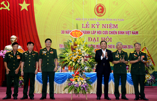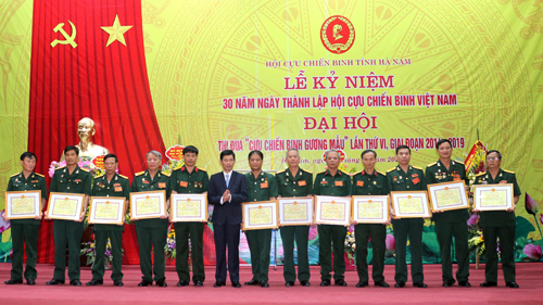 Các đồng chí lãnh đạo TW Hội CCB Việt Nam, lãnh đạo tỉnh Hà Nam tặng bằng khen cho các tập thể, cá nhân vì có thành tích xuất sắc trong phong trào thi đua CCB gương mẫu giai đoạn 2014 - 2019 Nhân dịp này, Trung ương Hội CCB Việt Nam đã trao tặng Cờ thi đua đơn vị xuất sắc cho tập thể Hội CCB tỉnh Hà Nam; nhiều tập thể, cá nhân được Trung ương Hội CCB Việt Nam, UBND tỉnh và Thường trực Hội CCB tỉnh tặng bằng khen vì có thành tích xuất sắc trong thực hiện phong trào thi đua CCB gương mẫu giai đoạn 2014-2019.