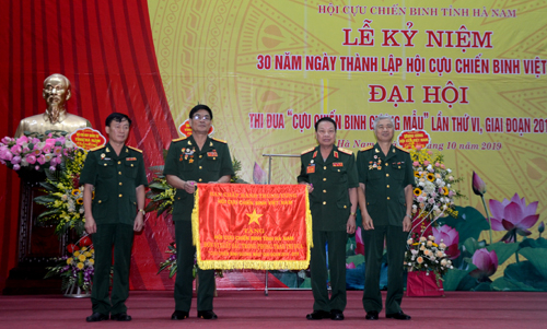 Trung tướng Nguyễn Văn Đạo, Phó Chủ tịch Trung ương Hội Cựu chiến binh Việt Nam tặng cờ thi đua xuất sắc trong phong trào CCB gương mẫu giai đoạn 2014 - 2019 cho Hội CCB tỉnh Hà Nam