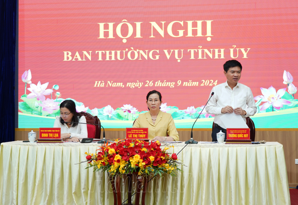 Tiếp tục chương trình làm việc, sáng 26/9, Ban Chấp hành (BCH) Đảng bộ tỉnh nghe Ban Thường vụ (BTV) Tỉnh ủy tiếp thu, giải trình các ý kiến thảo luận kết quả công tác 9 tháng đầu năm, nhiệm vụ trọng tâm quý IV năm 2024 của Tỉnh ủy; thực hiện quy trình công tác cán bộ và các nội dung quan trọng khác theo thẩm quyền. Các đồng chí: Lê Thị Thủy, Ủy viên Trung ương Đảng, Bí thư Tỉnh ủy, Chủ tịch HĐND tỉnh; Đinh Thị Lụa, Phó Bí thư Thường trực Tỉnh ủy; Trương Quốc Huy, Phó Bí thư Tỉnh ủy, Chủ tịch UBND tỉnh, Trưởng Đoàn ĐBQH tỉnh chủ trì hội nghị.